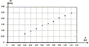 Il est nécessaire de déclencher l'acquisition lorsqu'un signal est reçu sur l'entrée B : Les ondes ultrasonores se propagent plus vite dans l'eau de mer que dans l'air : l'entrée B reçoit en premier un signal, puis ensuite l'entrée A. Expression du retard Dt entre la réception des ultrasons par les deux récepteurs en fonction de tA et tB: Dans l'air : d = vair tA. (1) dans l'eau : d = veau tB. (2) (1) - (2) donne : tA-tB = Dt = d ( 1/vair - 1/veau). vairet veau étant constantes, Dt et d sont proportionnelles : Dt = a d avec "a " une constante égale à : a = ( 1/vair - 1/veau). Le graphe correspondant Dt = f(d) est une droite passant par l'origine.