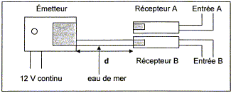 La célérité des ultrasons dans l'air vair = 340 m/s est plus faible que la célérité des ultrasons dans l'eau de mer veau. Un émetteur produit simultanément des salves d'ondes ultrasonores dans un tube rempli d'eau de mer et dans l'air (voir figure 1). A une distance d de l'émetteur d'ondes ultrasonores, sont placés deux récepteurs, l'un dans l'air et l'autre dans l'eau de mer. Le récepteur A est relié à l'entrée A du système d'acquisition d'un ordinateur et le récepteur B à l'entrée B. L'acquisition commence lorsqu'un signal est reçu sur l'entrée B du système.
