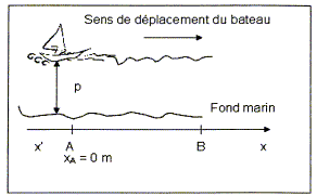 Dans cette partie on prendra veau = 1,50103 m/s. Un sondeur acoustique classique est composé d'une sonde comportant un émetteur et un récepteur d'onde ultrasonore de fréquence f = 200 kHz et d'un boîtier de contrôle ayant un écran qui visualise le relief des fonds sous-marins. La sonde envoie des salves d'ultrasons verticalement en direction du fond à des intervalles de temps réguliers ; cette onde ultrasonore se déplace dans l'eau à une vitesse constante veau. Quand elle rencontre un obstacle, une partie de l'onde est réfléchie et renvoyée vers la source. La détermination du retard entre l'émission et la réception du signal permet de calculer la profondeur p. Un bateau se déplace en ligne droite suivant un axe x'x en explorant le fond depuis le point A xA = 0 m jusqu'au point B xB = 50 m.