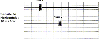 Le sondeur émet des salves d'ultrasons à intervalles de temps égaux, on mesure à l'aide d'un oscilloscope la durée Dt séparant l'émission de la salve de la réception de son écho. L'oscillogramme ci-dessous montre l'écran d'un oscilloscope lorsque le bateau se trouve en A (xA = 0 m). L'une des voies représente le signal émis, l'autre le signal reçu par le récepteur. Sur l'oscillogramme, on a décalé la voie 2 vers le bas pour distinguer nettement les deux signaux.