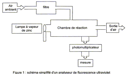 On se propose d'étudier dans cet exercice une des méthodes permettant de déterminer la concentration en dioxyde de soufre dans l'air : la fluorescence ultraviolet (UV). Principe de la méthode Dans l'air ambiant, les molécules de dioxyde de soufre SO2 sont dans un état d'énergie " fondamental " stable E0. L'air ambiant est aspiré par un analyseur, filtré pour éliminer les éléments " parasites " pour la mesure, puis envoyé dans une chambre de réaction dans laquelle il est soumis à un rayonnement ultraviolet dont la longueur d'onde est l1 = 214 nm et provenant d'une lampe à vapeur de zinc. Les molécules de dioxyde de soufre de l'air sont ainsi portées dans un état d'énergie E1. Cet état étant instable, le dioxyde de soufre de l'air se désexcite alors très rapidement et arrive dans un état d'énergie E2 différent de E0 en émettant un rayonnement UV de longueur d'onde l2 supérieure à celle du rayonnement d'excitation. Le rayonnement UV est reçu par un photomultiplicateur qui donne alors une tension de sortie US proportionnelle à la concentration en dioxyde de soufre présent dans la chambre de réaction.