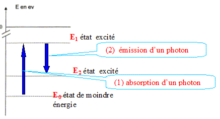 L'état d'énergie E1 de la molécule de dioxyde de soufre est un état excité. Les états d'énergie E0, E1 et E2 : E0 correspond à un niveau de moindre énergie. E1 est un état excité d'énergie supérieur à E0 : la molécule a gagné l'énergie hc/l1. Puis la molécule se désexcite et cède l'énergie hc/l2. Or la longueur d'onde l2 supérieure à celle du rayonnement d'excitation : donc hc/l2 < hc/l1. Étude de la transition entre les états d'énergie E0 et E1.