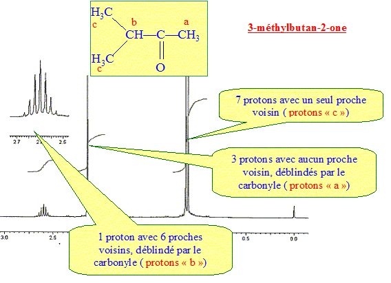 De quel groupement fonctionnel ces deux bandes révèlent-elles la présence ? groupe O-H libre : 3600 cm-1 ; groupe O-H lié par liaison hydrogène : bande large, forte vers 3300 cm-1. A quelle catégorie de composés organiques la substance A appartient-elle ? alcool. Un composé B de formule C5H10O se caractérise par la présence dans l'IR moyen une bande d'absorption à 1730 cm-1. Il donne un précipité jaune avec la 2,4 DNPH. Quel est le groupe fonctionnel présent dans le composé B ? Le test positif à la 2,4 DNPH et la bande d'absorption à 1730 cm-1 indique la présence d'un groupe carbonyle >C=O. Calculer la longueur d'onde l à laquelle se situe la bande d'absorption dans l'IR. Le nombre d'onde est le nombre d'oscillations de l'onde par unité de longueur ; le nombre d'onde est l'inverse de la longueur d'onde. l = 1/1730 =8,78 10-4 cm = 5,78 10-6 m. A quelles catégorie de composés organiques la substance B peut-elle appartenir ? aldehyde ou