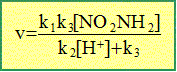 Décomposition de la nitroamine en solution aqueuse : NO2NH2 = N2O+H2O On propose le mécanisme suivant ( ki est la constanbte de vitesse de l'étape i ) : (1) NO2NH2 ---> NO2NH- + H+ k1. (2) NO2NH- + H+ --->NO2NH2 k2. (3) NO2NH- ---> N2O + HO- k3. (4) H+ + HO- ---> H2O k4. Choisir une définition pour la vitesse v de la réaction. v = d[N2O]/dt ou bien v = - d[NO2NH2]/dt. A l'aide de l'approximation des états quasistationnaires appliquée à l'espèce NO2NH- montrer que la vitesse de la réaction est :