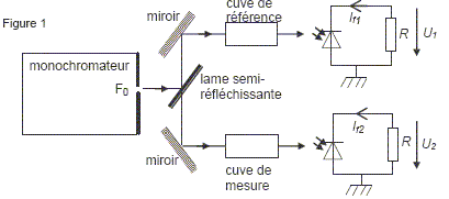 Le faisceau monochromatique obtenu après la fente F0 est séparé en deux faisceaux de même puissance lumineuse grâce à l'emploi d'une lame semi-réfléchissante et de deux miroirs plans. L'un des faisceaux passe à travers la cuve de référence contenant le solvant, et l'autre passe à travers la cuve de mesure contenant la solution à étudier. Chaque photodiode délivre un courant proportionnel au flux énergétique du faisceau. Les deux photodiodes sont identiques et délivrent une intensité If proportionnelle à la puissance lumineuse reçue P : If = kP. Donner l'expression de la transmittance de la solution à étudier en fonction de If1 et If2 puis l'expression de l'absorbance. La transmission T est définie comme le rapport de l'intensité transmise I à l'intensité incidente I0. T = I / I0 ; log T= -A. A= log (I0/I) ( A est l'absorbance ou densité optique) T1 = If1/ I0 ; T2 = If2/ I0 T1 =T2If1/If2. A1 = log( I0 / If1) ; A2 = log( I0 / If2) A1-A2 =log( If2 / If1) Donner la relation entre If1, U1 et R. U1 = RIf1 ; U2 = RIf2