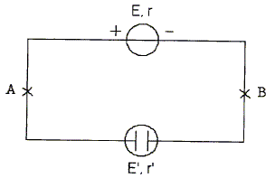 Un électrolyseur (de caractéristiques E'=4,0 V, r'= 1,0 W) est placé aux bornes d'un générateur de tension continue ( de caractéristiques E= 6,0 V ; r = 1,5 W). Le circuit est schématisé ci-dessous :