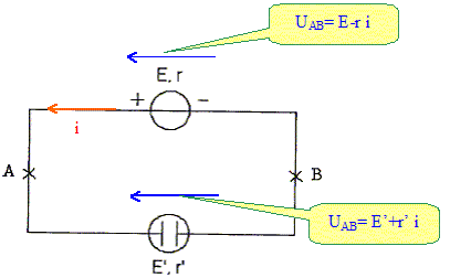 Etablir la relation donnant l'intensité du courant dans le circuit. E-r i = E'+ r' i E-E' = (r+r') i soit i = (E-E') / (r+r'). Vérifier que la valeur de l'intensité est 0,80 A. i = (6,0-4,0) / (1,0+1,5) = 2,0 / 2,5 = 0,80 A. Calculer la puissance électrique absorbée par l'électrolyseur. P = UAB i UAB = E'+r'i = 4,0 + 1,5*0,8 =5,2 V P= 5,2*0,8 = 4,16 W ( 4,2 W). Calculer le terme E'i. E' i = 4,0*0,8 = 3,2 W. Calculer le terme r'i2. r' i2 = 1,5*0,802 =0,96 W . Comment appelle t-on ce dernier terme ? puissance cédée par effet Joule.