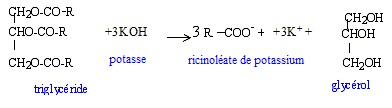 Masse d'hydroxyde de potassium nécessaire à l'obtention de 10 g de ricinoléate de potassium : La masse molaire du triglycéride est égale à : 3 masse molaire de R + ( 6*12+5+6*16) M = 3MR + 173 = 932 doù MR= (932-173) / 3 = 253 g/mol M (RCOOK) = 253+12+32+39=336 g/mol n(RCOOK) = m/M = 10/336 = 2,98 10-2 mol d'après les coefficients de l'équation ci-dessus : n( potasse) = n(RCOOK) m(potasse) = 2,98 10-2