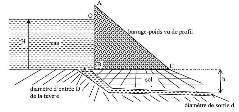 Données : densité du béton dB= 2,2 ; masse volumique de l'eau reau = 1,0 103 kg m-3 ; g= 9,8 N kg-1. Pour éviter des éventuels glissement de terrains sous l'action de la contrainte R, le barrage est équipé de 5 tuyères de sécurité. L'entrée de chaque tuyère est circulaire de diamètre D et la sortie circulaire de diamètre d. Le centre de la sortie est situé à une profondeur h= 50 m sous le niveau BC du barrage. D= 200 cm ; d= 40 cm Calculer le volume VB et la masse mB de béton utilisé lors de la construction ? VB = aire du triangle ABC * longueur du barrage = ½AB*BC*L VB =0,5*75*56*1000 =2,1 106 m3. 1 m3 de béton a une masse de 2,2 tonnes mB= 2,2*2,1 106 = 4,6 106 t. ( 4,62 106)