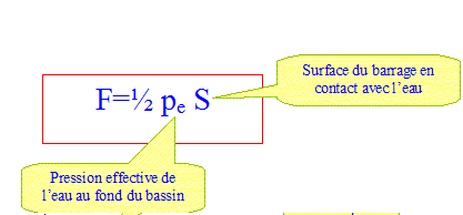 Etablir l'expression de F en fonction de reau, L, g et H : S = L H ; pe = reau g H F= ½reau g LH2. Valeur de F : F= 500*9,8*1000*702 = 2,4 1010 N. Valeur de la résultante des contraintes R :