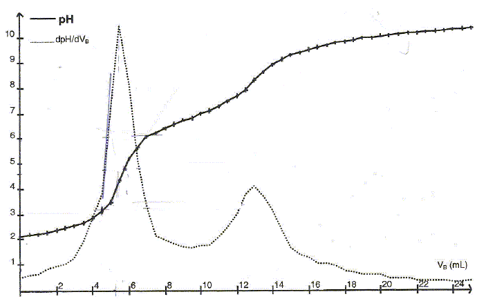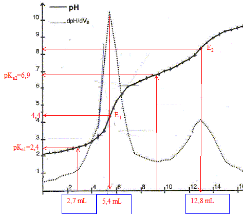 reflux : 2 : entrée de l'eau. 3 : réfrigérant droit 4 : ballon + boisson 5 : chauffe ballon Rôle du montage à reflux : en travaillant à température modérée on augmente la vitesse de la réaction tout en évitant les pertes de matière ( les vapeurs qui se dégagent se condensent dans le réfrigérant et retombent dans le ballon. Equations des réactions correspondant à ces deux dosages : HO- + H3PO4 = H2O + H2PO4-. HO- + H2PO4-= H2O + HPO42-. On peut retrouver sur la courbe de dosage les valeurs des pKa des couples de l'acide phosphorique : ces valeurs sont en accord ( à 10 % près) avec les valeurs théoriques.