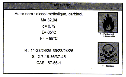 III. Amélioration du rendement : La lettre "R" correspond aux risques présentés par le méthanol. La lettre "S" correspond aux mesures de sécurité à mettre en oeuvre. Schéma annoté du montage de distillation fractionnée :