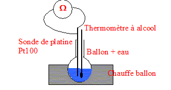 I. Le thermomètre à liquide : L'échelle Celsius utilise pour sa définition deux phénomènes physiques auquels on attribue les températures 0°C et 100°C : fusion de la glace et ébullition de l'eau sous une pression de 1 bar. L'échelle Celsius est qualifiée de "centésimale". L'intervalle de température repéré par les deux phénomènes physiques est divisé en 100 graduations. Une des propriétés physiques remarquable du mercure : liquide à température ambiante sous une pression de 1 bar. Les thermomètres médicaux à mercure sont interdits à la vente depuis 1998. En cas de casse, le mercure se répand sur le sol ; il est difficile à récupérer ; il s'évapore lentement, les vapeurs étant nocives. II. Etalonnage d'une sonde de platine ( Pt100) : La résistance de la sonde de platine est donnée par la relation : R(q) = R0[1+Aq + Bq2 +Cq3(q-100)], où q est la rempérature en °C. unité de A : Aq est sans dimension, q est en °C donc A est en °C-1. unité de B : Bq2 est sans dimension, q est en °C donc B est en °C-2. Schéma annoté du dispositif expérimental qui a permis de dresser le tableau :