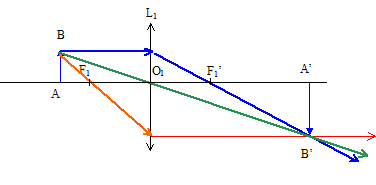 la lentille correspondant à un rayon incident : On écrit en gras et en bleu les distances algébriques. La lentille L1 est placée à 50 cm de l'objet AB de hauteur h= 1 cm. O1A= -0,5 m Position, nature et taille de l'image A'B' de l'objet AB : Formule de conjugaison :