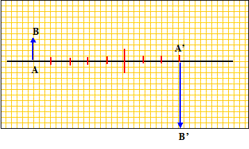 1/O1A'-1/O1A. O1A' étant positive, l'image est réelle. grandissement transversal : g = O1A'/O1A = 1/'-0,5) = -2 image renversée de taille 2h = 2 cm. Construction de l'image A'B' :