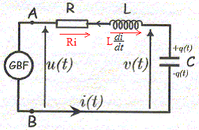 Expression de l'impédance complexe Z du dipôle AB en fonction de R, Q0 et x : z = R + jLw-j/(Cw) or w0 = (LC)-½ et Q0 = 1/R [L/C]½. w0Q0 = 1/(RC) soit 1/C = Rw0Q0 ; w0 / Q0 =R/L soit L =R Q0/ w0. z =R + jRQ0w/ w0 -jR Q0 w0/w ; z = R[ 1+jQ0(x-1/x)]. module de z : Z = R [1 +Q02(x-1/x)2 ]½. Valeur de Z si w = 31500 rad/s : x = 0,935 ; Q0 = 10. Z = 135[1+100(0,935-1/0,935)2]½ =226 W. L'impédance passe par une valeur minimale égale à R si x=1, c'est à dire si la pulsation du générateur est égale à la pulsation propre du dipôle RLC. En conséquence si la valeur efficace de la tension du GBF est constante, l'intensité passe par une valeur maximale I0 si x=1. On dit il y a résonance d'intensité. Calcul de I0 si U0 = 5,4 V : I0 = U0/R = 5,4 / 135 = 0,04 A. Tension efficace V0 aux bornes du condensateur à la résonance d'intensité : impédance du condensateur : 1/(Cw0) = 1/(22 10-9 *3,37 104) = 1349 W ; V0 = I0 /(Cw0) = 0,04*1349 = 54 V. On observe une surtension ( égale à Q0U0) aux bornes du condensateur, à la résonance d'intensité.