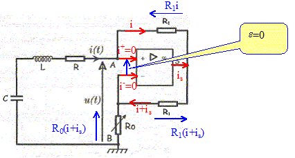 u(t) = R0(i+is) ; u(t) = R1i + (R1+R0)( i+is) d'où R1i +R1( i+is) =0 soit is = -2i Par suite : u(t) = -R0i(t) Valeur de R0 conduisant à l'entretien des oscillations : En notant v(t) la tension aux bornes du condensateur :