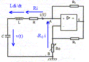 v(t) + R i(t) + Ldi(t) /dt-R0i =0 si R = R0 : v(t) + Ldi(t) /dt = 0 ( éq. différentielle de l'oscillateur libres non amorti) La puissance instantanée mis en jeu dans le dipôle RLC est dissipée dans le conducteur ohmique R : p = R i2(t) A chaque instant les alimentations de l'amplificateur opérationnel fournissent au dipôle RLC la puissance R i2(t) et compensent ainsi la puissance perdue par effet Joule.