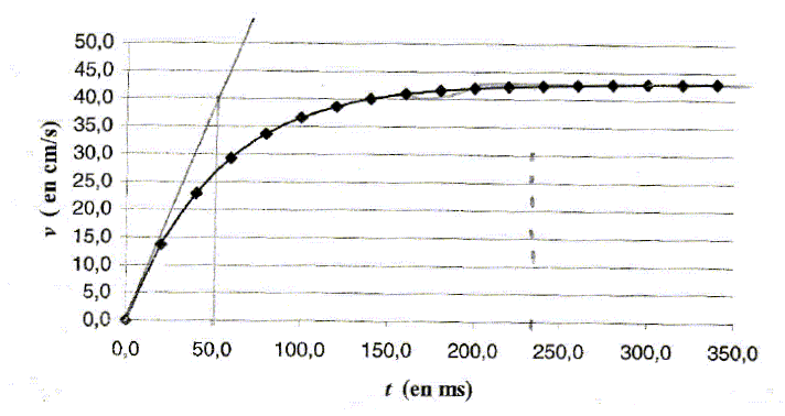 Apartir d'une chronophotographie, la vitesse instantanée d'un mobile se calcule à partir de : v(ti) = [OMi+1-OMi-1] / (2Dt). Dt durée petite, intervalle de temps séparant deux chronophotographies successives. vl : vitesse limite de chute ( m/s) ; t : constante de temps (s).