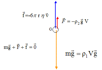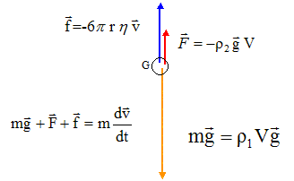 I. Bilan des forces : référentiel : objet par rapport auquel on se repère pour l'étude du mouvement d'un système ; on lui associe un repère et une origine des temps. référentiel galiléen : dans ce référentiel le principe d'inertie ou 1ère loi de Newton s'applique " un point matériel pseudo-isolé demeure dans son état de repos ou de mouvement rectiligne uniforme". Retrouvons par analyse dimensionnelle, l'unité S.I de la viscosité du fluide : f : force ou masse * accélération ou masse * longueur / temps2 ; [f]= M L T-2. 6p : sans dimension ; r : longueur ; [r]= L. ; v : vitesse ou longueur / temps ; [v]= L T-1. h= f/(6p rv) ; [h]= M L T-2L -1 T L-1 ; [h]= ML -1T-1 Bilan des trois forces qui s'appliquent à la bille : poids : vertical, vers le bas, valeur mg avec m = 4/3pr3r1 ; P= 4/3pr3r1 gi. Poussée d'archimède : verticale, vers le haut, valeur 4/3pr3r2g ; F= 4/3pr3r2 g(-i). frottement : vertical, vers