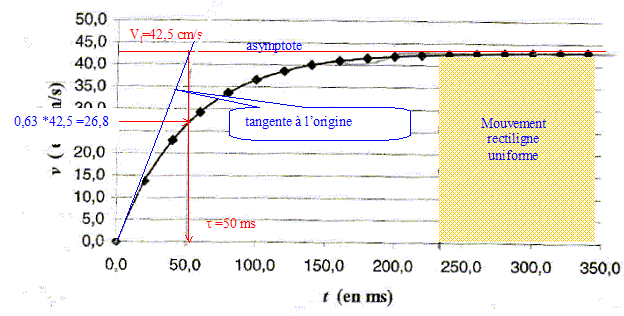 Une modélisation ultérieure donne l'évolution de la vitesse de la forme : v(t) = vl(1-exp(-t/t)).