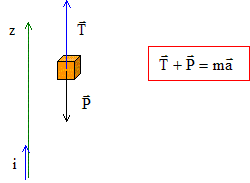 Ecrire la deuxième loi de Newton suivant l'axe z : T=ma-mg ; T= m(a-g). phase 1 : T1 = 800(1,5+10) = 9,2 103 N. phase 2 : T2 = 800(0+10) = 8 103 N. phase 3 : T3 = 800(-1,5+10) = 6,8 103 N. Distance parcourue par l'ascenseur lors des différentes phases : phase 1 : a1=1,5 m/s2 ; vitesse initiale nulle v= a1 t ; z1 = ½a1t2 ; z1 = 0,75 *22 = 3 m. phase 2 : mouvement rectiligne uniforme v = 3 m/s. z2 = 3*8 = 24 m. phase 3 : v10 = 3 m/s ; v12 =0 ; a3 = -1,5 m/s2. v122-v102 =2a3z3 ; z3 =(v122-v102 )/(2a3) = -9/(-3) = 3 m. Indication du pèse personne durant les différentes phases : Référentiel terrestre galiléen ; le système est le pèse personne.