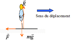 L'ensemble des forces de frottements est assimilée à une force unique, opposée au mouvement d'intensité constante F= 50 N. Le skieur reste constamment en contact avec le sol.
