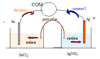 - Sn(s) / Sn2+(aq) + 2 Cl-(aq)// Ag+(aq) + NO3-(aq) / Ag(s) +. On dispose d'une lame d'étain, d'une lame d'argent,d'une solution de nitrate d'argent de concentration molaire volumique 0,10 mol/L, d'une solution de chlorure d'étain de concentration molaire volumique 0,10 mol/L, d'un pont salin contenant une solution saturée de nitrate de potassium K+(aq)+ NO3-(aq) et de bechers.