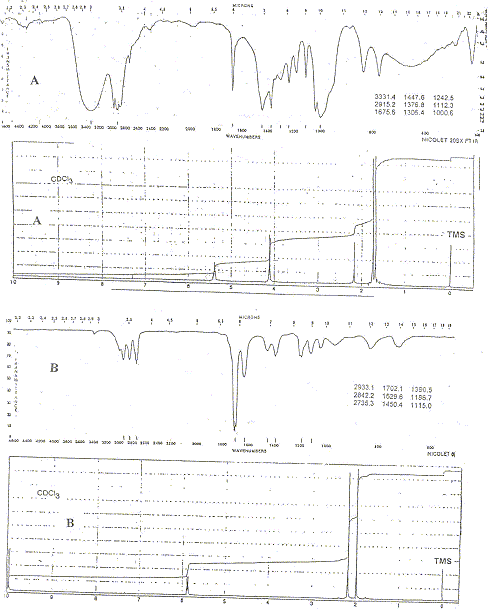 Proposer les structures de A et B. On donne les spectres IR et RMN. A : le spectre IR indique une large bande vers 3000 cm-1 ( fonction alcool), une absence de bande vers 1700 cm-1 ( pas de groupe >C=O) et un pic vers 1600 cm-1 ( liaison >C=C<) Le spectre RMN indique : un singulet à 2,2 ppm ( 1 proton) -OH alcool, un singulet à 4,1 ppm ( deux protons) -CH2-O, un singulet à 5,5 ppm ( 1 proton) C=CH alcène, deux singulets vers 1,7 ppm ( 2*3 protons ) deux groupes CH3 déblindés. HO-CH2-C(CH3)= CH-CH3. B : le spectre IR indique une bande vers 1700 cm-1 ( groupe >C=O) et un pic vers 1600 cm-1 ( liaison >C=C<) Le spectre RMN indique : un singulet à 10 ppm ( 1 proton) -CHO aldehyde, un singulet à 6 ppm ( 1 proton) C=CH alcène , deux singulets vers 2 ppm ( 2*3 protons ) deux groupes CH3 déblindés. CHO-C(CH3)= CH-CH3. Oxydation d'un alcool primaire en aldehyde. Exercice