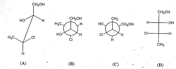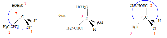(A et D) : énantiomères ; (C et D) : diastéréoisomères ; (A et B) diastéréoisomères ; (A et C) diastéréoisomères ; (B et C) conformères. Dans la représentation D, le carbone porteur du groupe OH est dextrogyre (D), le carbone porteur du Cl est lévogyre (L): Ces deux atomes de carbone sont S( sinister)