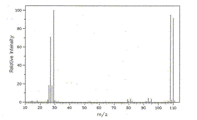 Les 2 pics à M et à M+2 ( 108 et 110) d'égale hauteur indique la présence d'un atome de brome. L'ion apparaissant à la masse m/e=108 correspond au pic moléculaire dont le rapport m/e vaut 1. Il s'agit d'un radical cation (espèce portant un électron dépareillé et une charge positive, formé lors du choc d'un électron contre d'une molécule neutre ). pics à 79 et 81: Br. ; pic à 29 : CH3-CH2+. ; pic à 27 CH2=CH+. ;