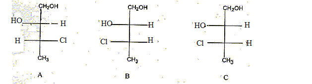Représenter les composés A, B et C en représentation de Fischer. Quelle relation existe t-il entre les composés (A et D), (C et D), (A et B), (A et C), (B et C) ? Dans la représentation D, indiquer la configuration absolue des deux carbones asymétriques.