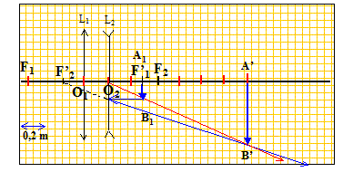 - A. N : quelle est la distance focale image de la lentille convergente équivalente avec f'1 = 50 cm et f'2 = -40 cm et e = 20 cm ? Si le système des deux lentilles est convergent, l'image d'un point source situé à l'infini est réelle. L'image se forme au foyer principale image du système ; cette image est inversée par rapport à l'objet. On notera AB l'objet, A1B1 l'image intermédiaire donnée par L1 de l'objet AB. A1B1 joue le rôle d'objet pour la lentille L2 ; l'image définitive est notée A'B'. L'objet étant à l'infini, l'image A'B' est situé au foyer image du système.