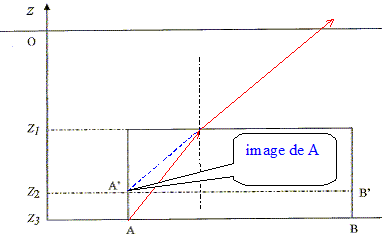 Le déplacement de l'image A' par rapport à l'objet A a pour expression : AA' = e( 1-1/n) avec e = z1-z3 et AA' = z2-z3. AA'/e = 1-1/n ; 1/n = 1-AA'/e ; 1/n =( e-AA' )/ e n = e/(e-AA') = (z1-z3) / (z1-z2). n= (12,0116-11,9811) / ( 12,0012-11,9811) = 0,0305 / 0,0201 ; n = 1,5174.