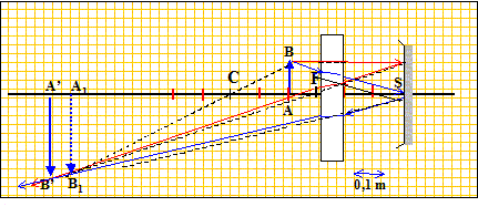 AB : objet ; A1B1: image intermédiaire donnée par le miroir sphérique ; A'B' : image définitive. sens positif : celui de la lumière incidente ( le sens change après réflexion sur le miroir) Relation de conjugaison pour le miroir avec origine au sommet : 1/ SA1 -1/ SA = -2/SC ; 1/ SA1 = -2/SC +1/ SA avec SA = -0,4 m , SC = -0,6 m 1/ SA1 =2/0,6 + 1/(-0,4) =3,333-2,5 = 0,833. SA1 =1,2 m. A1B1 joue le rôle d'objet pour la lame à faces parallèles. Le déplacement de l'image A' par rapport à l'objet A1 a pour expression : AA1 = e( 1-1/n) = 0,09(1-1/1,5) =0,03 m