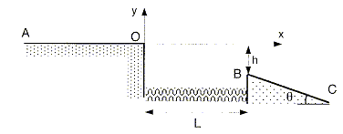 Entre O et B, le solide étudié n'est soumis qu'à son poids : la chute est libre. Dans le repère Oxy, l'accélération a les composantes (0 ; -g ) La vitesse est une primitive de l'accélération : vx= v0 ; vy= -gt La position est une primitive de la vitesse : x= v0t ; y = -½gt2. Equation de la trajectoire de G entre O et B : Eliminer le temps dans les deux relations précédentes : t = x/v0 ; repport dans y : y= -½gx2/v02 (1) Composantes du vecteur vitesse en B : abscisse du point B xB= L ; ordonnée de B yB=-h. vBx=v0. xB= L = v0tB ; tB = L / v0. repport dans vy : vBy= -gL/v0 ; Le vecteur vitesse en B est parallèle à BC : tan q = |vBy| /vBx= gL/v02 ; (1) donne v02 = -½gxB2/yB=½gL2/h ; v0 = L[½g/h]½ = 23,2[5/6,7]½ =20,0 m/s. par suite : tan q = 2h/L = 2*6,70/23,2 =0,58 ; q =30,0°.