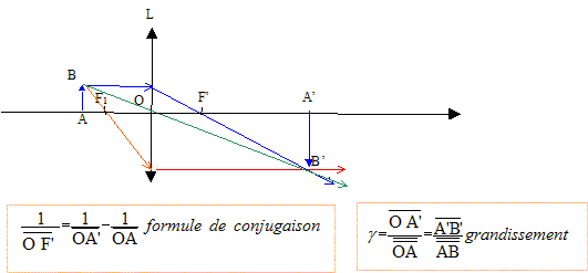 D= AO+ OA' ; g =-2 = OA' / OA ; OA = -OA' / 2 ; AO =½OA' D= ½OA' +OA' ; OA' = 2/3 D. OA = - 1/3 D. 1/OF' = 3/(2D) - 3/(-D) = 4,5 /D ; OF' =D/4,5. Applications numériques : OF' =0,09/4,5 = 0,02 m = 2,00 cm. OA = -0,09/3 =-0,03 m = -3,00 cm. OA' = 2*0,09/3 = 0,06 m = 6,00 cm.