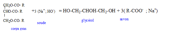 Masse molaire du triester : quantité de matière initiale : n(T) = m/M = 18/M mol quantité de matière initiale de soude : n0= 4/40 = 0,1 mol quantité de matière d'acide versé lors du dosage : 2*16,5 10-3 = 0,033 mol quantité de matière de soude en excès : 0,033 mol quantité de matière de soude ayant réagit avec le triester : 0,1-0,033 = 0,067 mol quantité de matière de triester : n(T) = 0,067/3 = 2,23 10-2 mol. par suite 18/M= 2,23 10-2 soit M= 18/2,23 10-2 = 806 g/mol. Masse molaire et formule semi-développée de l'acide gras saturé qui a servi à préparer le triester : Formule brute du triester : C6H5O6R3. M= 12*6+5+6*16+3MR = 806. MR = 211 g/mol formule de l'acide gras : R-COOH de masse molaire : 211+12+32+1 =256 g/mol. Formule brute de l'acide gras saturé : CnH2nO2 ; M=12n+2n+32 = 256 ; n = 16 CH3-[CH2]14-COOH. Formule du solide recueilli après filtration : CH3-[CH2]14-COO- + Na+. Ce solide a des propriété détergentes.