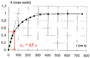est atteinte à t = 750 s. A t½, l'avancement est égal à la moitié de sa valeur finale ; or l'avancement et l'absorbance sont proportionnels ; d'où par lecture graphique pour A= 0,5 :
