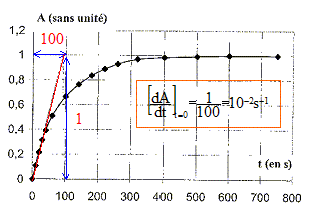 Coefficient directeur de la tangente à l'origine de la courbe A=f(t), à la date t=0 fois 0,01. v = 10-4 mol L-1 s-1. A t = 750 s, la tangente à la courbe étant horizontale, le coefficxient directeur de cette tangente est nul. En conséquence la vitesse est nulle.