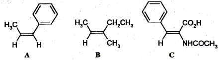 Les groupes portés par chaque carbone doublement liés sont classés par priorité décroissante en utilisant les règles de Cahn, Ingold et Prelog. - Les atomes sont classés par numéro atomique décroissant. En cas d'égalité on passe aux atomes qui leurs sont liés ( atomes de second rang) et ainsi de suite. A : CH3 et C6H5 , groupes prioritaires,sont situés du même côté : configuration Z. B : CH3 et CH2CH3 , groupes prioritaires,sont situés du même côté : configuration Z. C: NHCOCH3 et C6H5 , groupes prioritaires,sont situés de part et d'autre : configuration E.