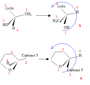 carbone asymétrique : carbone tétragonal lié à 4 groupes différents. La présence d'un carbone asymétrique indique qu'une molécule est chirale. B possède un carbone asymétrique ( celui porteur du groupe OH) : B est chirale. D possède un carbone asymétrique ( celui porteur du groupe OMe) : D est chirale. E possède un carbone asymétrique : E est chirale. F possède deux carbones asymétriques : F est chirale. Donnez la configuration absolue des atomes de carbone 4 et 5 en indiquant l'ordre de priorité pour chaque carbone.