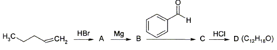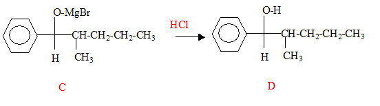 L'addition de HBr sur la double liaison donne le 2-bromopentane CH3-CHBr-CH2-CH2-CH3. Passage au magnésien B : CH3-HC(MgBr)-CH2-CH2-CH3. L'addition du magnésien sur le carbonyle donne :