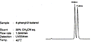 différencier : Analyse élémentaire ; RMN 1H ; RMN13C ; point d'ébullition ; pouvoir rotatoire ; absorption UV. Un échantillon de 4-phényl-2-butanol a été préparé par réduction à l'aide d'alumino hydrure de lithium de la cétone correspondante. Les analyse RMN et masse montrent que le produit a une grande pureté, une HPLC sur une colonne particulière à base d'un dérivé de cellulose donne le chromatogramme suivant, dont les deux pics ont la même surface.