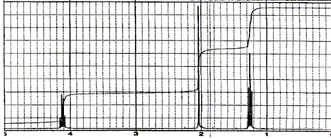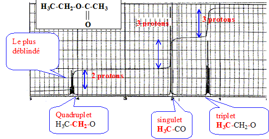 Il n'y a aucun pic en dehors de la zone 0 à 5 ppm. Quel est le signal le plus déblindé ? Quels serait les déplacements chimiques des signaux à 400 MHz ? De quel composé de formule brute C4H8O2 s'agit-il ? A 400 MHz les déplacements chimiques relevés sur le spectres seraient multipliés par 3/4.