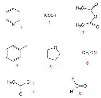 acétique 4 : toluène 5 : tétrahydrofuranne 6 : acétonitrile 7 : acétone 8 : formaldehyde