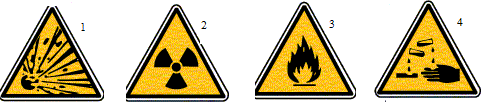Citer pour chaque pictogramme un produit chimique représentatif du risque. Indiquer les consignes de prudence à adopter dans chaque cas. (1) explosif : trinitrotoluène, pechlorate de sodium, tenir à l'écart de substances combustibles et à l'écart des sources de chaleur . (2) danger radioactivité : uranium 235, radium. (3) inflammable : éthanol, éther éthylique, conserver à l'écart de toute flamme ou source d'étincelles. (4) corrosif : acide sulfurique, tenir à