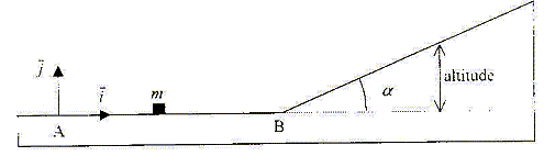 v0 = 4 m/s ; m = 100 g ; d= 7 m ; F=0,05 N; g = 10 m/s² ; sin a =0,1.