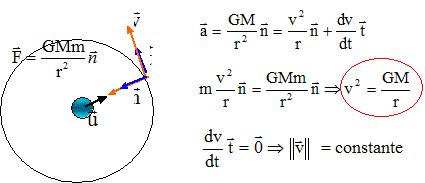 L'accélération est centripète : a = v2/r n. Force F P/S exercée par P sur S en fonction de m, M, G, r et n. La force est centripète : F P/S = GM m /r2n. Equation reliant v à r, G et M : v= [GM/r]½. Expression de T2 en fonction de r, G et m. Le satellite décrit une circonférence 2pr en une période T à la vitesse v : 2pr = v T soit T = 2pr / v ; T2 = 4p2r2 / v2 remplacer v2 par son expression GM/r d'où : T2 = 4p2r3 /(GM). (3ème loi de Kepler ) Valeurs littérale et numérique de M : M= 4p2r3 / (GT2) ; r = 2,12 108 m ; T = 296*3600 = 1,065 106 s. M = 4*3,142 * (2,12 108 )3 / (6,67 10-11*1,0652 1012 )=4,97 1024 kg.
