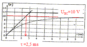 A. Coefficient directeur de la tangente à la courbe ci-dessus à t=0 : [dUBC/dt]t=0 = 10 /2,5 10-3 = 4 103 V s-1. or uBC = R i(t) d'où : [dUBC/dt] = R [di/dt] [di/dt]t=0 =1/R [dUBC/dt]t=0 =4000 / 40 ; [di/dt]t=0 = 100 A s-1. Equation différentielle à laquelle obéit l'intensité du courant traversant le circuit :